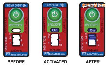 TempDot™Plus標(biāo)簽應(yīng)存儲(chǔ)在室溫下,,并必須在反應(yīng)溫度閾值以上被激活。激活是通過(guò)用手指推壓。"On"字出現(xiàn)在第一個(gè)窗口中顯示激活。之后5分 鐘內(nèi),,在反應(yīng)溫度或低于反應(yīng)溫度的情況下將標(biāo)簽貼到產(chǎn)品上。藍(lán)色染料熔化并以控制的速率遷移,經(jīng)過(guò)白色大窗口。這表示暴露在溫度閾值以上的累計(jì)時(shí)間。當(dāng)溫 度低于閾值時(shí),該染料固化并停止移動(dòng)。如果溫度超過(guò)閾值,,TempDot®Plus標(biāo)簽提供即時(shí)的視覺(jué)跡象。